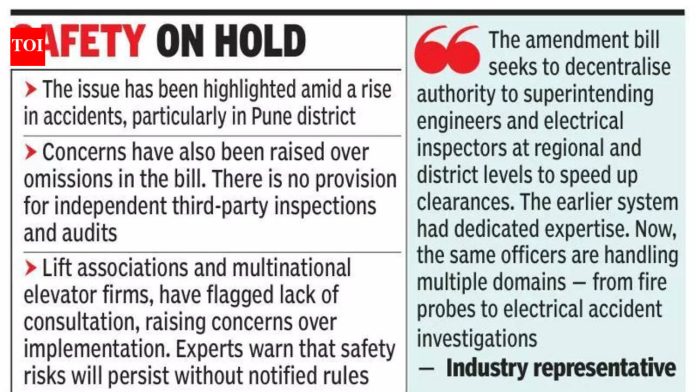 पुणे: महाराष्ट्र लिफ्ट्स, एस्केलेटर आणि मुव्हिंग वॉकवे कायदा, 2017, कार्यान्वित करण्याच्या नियमांच्या विलंबामुळे मंजूर होऊन नऊ वर्षे उलटूनही प्रलंबित आहे, जरी लिफ्टशी संबंधित अपघातांमुळे राज्यभरात तपासणी आणि अंमलबजावणीमधील तफावत दिसून येते, असे नागरिकांच्या गटांनी सांगितले.राज्याने अलीकडेच लिफ्ट्स, एस्केलेटर आणि मूव्हिंग वॉक (सुधारणा) विधेयक, 2026 सादर केल्यामुळे या समस्येची निकड निर्माण झाली आहे, जे अधिकारांचे विकेंद्रीकरण प्रस्तावित करते. मंत्रालयाच्या अधिकाऱ्यांनी सांगितले की, “कायद्यातील कोणत्याही सुधारणांमुळे नियमांना आणखी विलंब होईल.”अधिकाऱ्यांनी सांगितले की नियम BIS मानकांसह संरेखन, अद्ययावत तांत्रिक वैशिष्ट्ये, फायर इव्हॅक्युएशन प्रोटोकॉल आणि 20 वर्षे लिफ्टचे ऑपरेशनल आयुष्य निश्चित करण्याचा प्रस्ताव देतात. अधिकृत वार्षिक देखभाल कराराद्वारे लिफ्टची देखभाल केली जात नाही अशा प्रकरणांमध्ये गृहनिर्माण संस्थेच्या पदाधिकाऱ्यांवर जबाबदारी निश्चित करण्याचा प्रयत्न केला जातो.वरिष्ठ अधिकाऱ्यांनी सांगितले की, कायदा आणि न्याय विभागाने “कायद्याशी सुसंगत” नसल्यामुळे गेल्या महिन्यात मसुदा नियम परत केला. ऊर्जा विभागाची मंजुरीही प्रलंबित आहे. मंत्रालयाच्या एका अधिकाऱ्याने TOI ला सांगितले की, “नियमांशिवाय कायदा लागू केला जाऊ शकत नाही.”अधिसूचित नियमांच्या अनुपस्थितीत, कालबाह्य झालेल्या बॉम्बे लिफ्ट नियम, 1958 अंतर्गत लिफ्ट ऑपरेशन्स सुरू राहतात, ज्यामध्ये उच्च-स्पीड लिफ्ट, एस्केलेटर आणि फिरणारे वॉकवे किंवा अद्ययावत सुरक्षा प्रोटोकॉल यांसारख्या आधुनिक प्रणालींचा पुरेसा समावेश होत नाही, असे कार्यकर्त्यांनी सांगितले.विशेषत: पुणे जिल्ह्य़ात वाढत्या अपघातांमुळे हा मुद्दा अधोरेखित झाला आहे. चऱ्होलीमध्ये 12 वर्षीय मुलाचा मजल्यांमध्ये अडकून मृत्यू झाला, वाघोलीत सहा प्रवाशांसह लिफ्ट कोसळली, तर पिंपरी-चिंचवडमध्ये लिफ्टच्या दारात मुलाचा हात अडकला. 2024-25 मधील एकाही अपघाताच्या तुलनेत 2025-26 मध्ये जीवघेण्या अपघातांची संख्या 12 वर पोहोचली, असे ऊर्जा विभागाच्या आकडेवारीत म्हटले आहे.तज्ञांनी या प्रवृत्तीचे श्रेय सुमारे 2.1 लाख लिफ्टचा अनुशेष अनिवार्य वार्षिक तपासणी आणि तीव्र मनुष्यबळ टंचाईला दिले. ते म्हणाले की विद्युत निरीक्षक – आता अनेक जबाबदाऱ्या हाताळत आहेत – परवाना आणि नवीन मंजूरींना प्राधान्य द्या – नियमित तपासणीने बॅकसीट घेतले आहे.“प्रणाली प्रतिक्रियात्मक आहे, प्रतिबंधात्मक नाही. तपासणी हा सुरक्षेचा कणा असतो आणि तिथेच बिघाड होतो,” असे एका वरिष्ठ विद्युत सुरक्षा तज्ज्ञाने सांगितले.पुढे, अधिकाऱ्यांनी सांगितले की दुरुस्ती विधेयक प्रादे