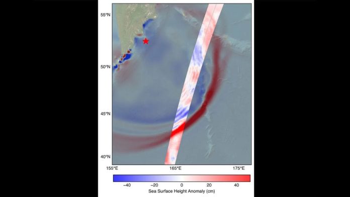 यूएस-फ्रेंच एसडब्ल्यूओटी (पृष्ठभागाचे पाणी आणि महासागर टोपोग्राफी) उपग्रहाने 30 जुलै, 2025 रोजी पॅसिफिक महासागरामधून (स्थानिक वेळेनुसार सकाळी 11:25 वाजता) रशियाच्या कामकाटका पेनिन्सुलावर धडक दिली. भूकंप झाल्याच्या सुमारे 70 मिनिटांनंतर उपग्रहाने डेटा हस्तगत केला. एसडब्ल्यूओटी हे पृथ्वीवरील महासागर आणि गोड्या पाण्याचे नकाशे तयार करण्यासाठी डिझाइन केलेले आहे. त्सुनामीकडून उपग्रहाने डेटा खोल समुद्रातून जात असताना डेटा रेकॉर्ड केला.